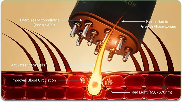 Red light (650-670nm) penetrates into hair follicles and energizes the mitochondria - the cellular powerhouses. This boosts ATP production by up to 3x, which: